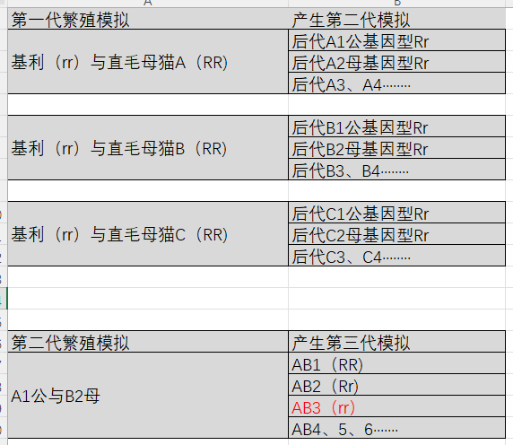 基利和其他母猫基因交换以后,产生的后代必然是Rr,表现为直毛,但是携带卷毛基因。基利子代与子代交换基因就有25%产生卷毛。基利的孙代中就有此基因为rr的了,也就是德文卷毛猫了,而两个德文卷毛必然产生卷毛,这个品种就慢慢就固定下来了